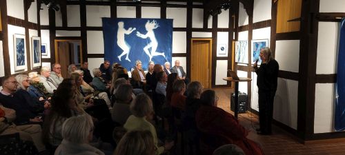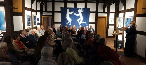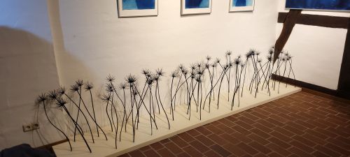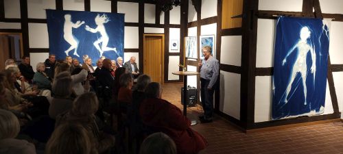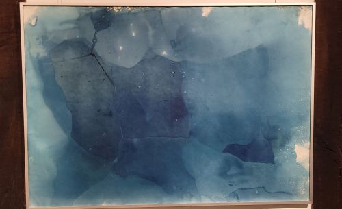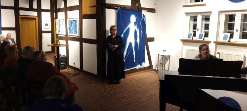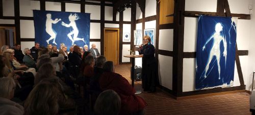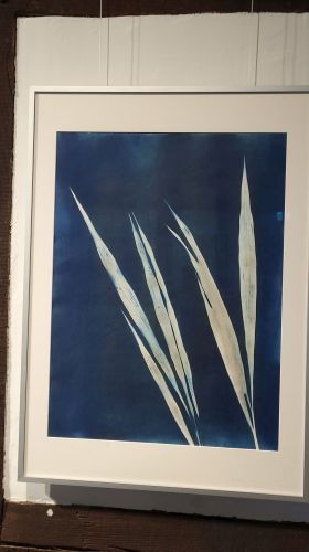 Zu sehen sind Cyanotypien von Nike Gerochristodoulou, deren künstlerische Praxis Fotografie, Naturbeobachtung und Materialprozesse verbindet. Die Künstlerin ist Diplom-Fotodesignerin und in Ihrem Atelier auf Gut Groß-Engershausen lässt sie sich von Spuren und Strukturen der lebendigen Welt inspirieren, sie arbeitet mit den Elementen der Natur. Die Technik der Cyanotypie ist mehr als 180 Jahre alt. Unter Einwirkung des natürlichen Sonnenlichts entstehen künstlerische Arbeiten in der Natur, die immer Unikate sind und nicht zu 100% planbar von der Künstlerin, weil das Wetter/die Sonneneinstrahlung die entscheidende Rolle spielt. Faszinierende Arbeiten von einem ganz besonderen Reiz!